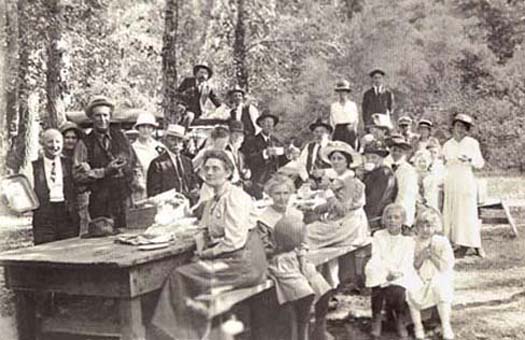 Bertha and mother, Emma, picnicking with the Manchester family with Velie in background